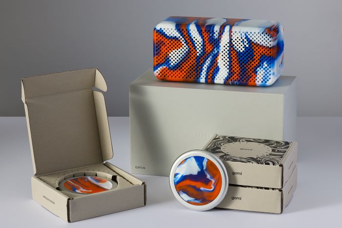 As an independent company committed to creating easy-to-repair products from recycled materials, gomi has produced more than 10,000 items to date, including speakers, power banks, phone cases, location tracker tags, and cables. Each piece is handmade in Brighton and features gomi’s signature marbled finish, created by blending recycled plastics into unique colourways. Over recent years, the studio has collaborated with brands including Paul Smith, Vans and Chilly’s – with goplasticpallets.com the latest organisation to partner with the team.